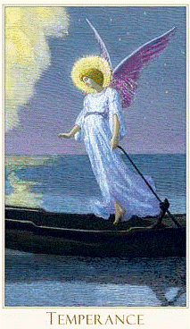 Выбранная нами картинка также визуально связана с Шестёркой Мечей, на которой изображена лодка, движущаяся по воде, хотя на младшей карте ей не управляет ангел. Обе карты связаны с тихим движением по жизни, хотя Шестёрка Мечей соотносится скорее с переживанием конкретного сложного периода, в то время как Воздержание, как Старший архетип, имеет отношение скорее к умеренности вообще, и в Вашей жизни, и в мире вокруг Вас. Может иметься в виду целый ряд вещей или людей – следует воздерживаться от переедания или пьянства, не отвечать вспышкой гнева на оскорбление, быть терпимым к убеждениям других – и много чего ещё. Однако в XIX веке по всей Европе и Америке понятие умеренности было конкретно привязано к воздержанию от спиртного, поскольку "Движение умеренности" было активно как никогда. Как бы Вы ни относились к этому, жаль, что таким образом было искажено понимание умеренности, которую мы до сих пор иногда воспринимаем скорее в ассоциации с вопросами алкогольного опьянения, а не с чем либо ещё. Когда Вы смотрите на эту карту, и спокойный, тихий ангел правит лодкой на срединном пути, помните, что умеренность и сдержанность могут быть применимы во многих сферах жизни.