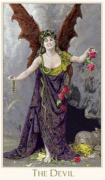 Эта карта традиционно предостерегает нас от искушения, отталкивая нас от нездоровых желаний, и в целом от потери контроля в опасной ситуации. Кажется, что женщина на картинке предлагает множество вещей – красоту цветов, притягательность денег, и, что тоже подразумевается, привлекательность физической страсти. Однако в то же время мы можем истолковать эту картинку как знак того, что злобность может принести независимость и освобождение – эта женщина-дьявол выглядит весьма уверенной. В некоторых контекстах эту карту можно толковать как предлагающую свободу – иногда нам необходимо позволить своим желаниям освободиться от старых запретов. Но будьте осторожны, не поддавайтесь желанию интерпретировать эту карту таким образом во всех, кроме совсем уж исключительных, случаях. В основном же, нравится Вам это или нет, карта Дьявола предупреждает, что Вас могут захватить и контролировать – в старых колодах Таро на этой карте часто изображены мужчина и женщина, прикованные цепями к устрашающему рогатому чёрту. Послание таково – что же предлагается нам в качестве свободы? Кто из нас не мечтал, что бы он сделал, будь он богаче, красивее, сильнее, любимее? – а в действительности это ловушка. Если посмотреть более внимательно на фигуру, изображенную на карте, мы увидим, что она растаптывает ногами белые лилии, символ чистоты. Нам говорят, последуете за ней, и Ваши чистые намерения, Ваши этика и мораль могут быть в конце концов разрушены и уничтожены.
