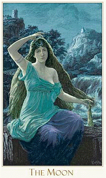 Для Луны мы подобрали картинку с изображением женщины, немного дистанцированной от реальности, почти в трансе, она смотрит в никуда и расчёсывает свои длинные волосы. Её гребень и жемчуга напоминают лорелею или сирену, немецкий эквивалент русалки, заманивавшей мужчин на погибель, коли уж они соблазнялись ею. Серпик луны у неё на голове напоминает о классическом изображении "Ночи", а также Артемиды, девственной богини охоты и луны. В этой фигуре есть что-то и от богини, и от сирены. Она очаровательна, но она и опасна, так же как сны и видения. Когда Луна появляется в раскладе, Вы можете относиться благосклонно к грёзам и фантазиям, которые она предлагает, но нелишним будет помнить о риске быть соблазнённым ими. Ибо однажды полностью удалившись в мир иллюзий, можно уйти так далеко, что найти путь назад в реальность уже будет трудно.