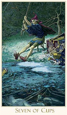 Конечно, некоторые вещи, виднеющиеся в воде могут соблазнить и приманить. Это деньги, власть, искусство и красота, которые надеты на крючок. Такие волшебные подарки, по народным поверьям, могут исчезнуть как туман, когда наступит утро. Или ... они могут все осуществиться. Возможно, некоторые из искушений реальны и только и ждут на берегу, чтобы быть схваченными? Семерка Кубков говорит о возможностях. Это указывает на всяческие мечты, желания и амбиции. Это заставляет нас выбирать между ними, а также отделить реальное от невозможного.