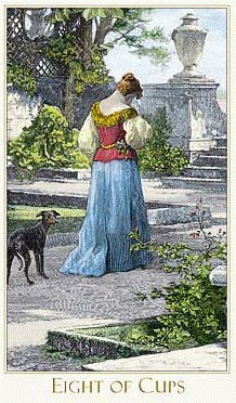 Восьмерка Кубков говорит нам о трудностях расставания с чем-либо, и даже в его самом положительном аспекте, это сопряжено с определённой печалью. Когда мы двигаемся вперёд, нам необходимо одновременно и смотреть назад, сожалея, и смотреть вперёд, надеясь. Это может означать момент, когда Вы добровольно оставляете работу, которая стала Вас ограничивать и уже вызывает уныние. Это может означать бегство из тупиковых отношений или просто отъезд с мест, где Вы жили, любили, но где чувства уже больше не дают Вам того, в чём Вы нуждаетесь. Карта указывает на те времена, когда Вы оставляете что-то с трудностью и некоторой болью, но зная, что это во имя лучшего.