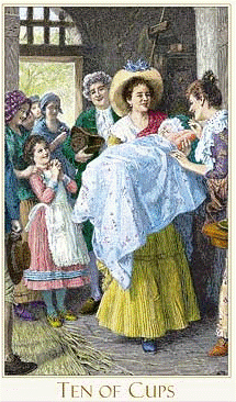 Десятка Кубков или карта Таро "Счастливая Семья" – это прямое сообщение о внутренней гармонии, родителях и детях, счастливом завершении и любви, о доверии в пределах семей. Картина показывает празднование рождения младенца расширенной семьей друзей и родственников, старых и молодых, и которая является разновидностью семьи, что многие из нас сейчас строят вокруг себя.