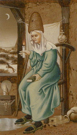 Молодая женщина сидит возле окна. В левой ее руке книга – символ философии магов и знания. В правой, горящая свеча, означающая озарение, просветление. На поясе висит крест, а голову украшает улей. В отверстие влетает пчелка, но только одна. Улей символ монастырского братства, но тут пчелка одинока, так же как сама Жрица. Она словно монашка оторвана от мира.