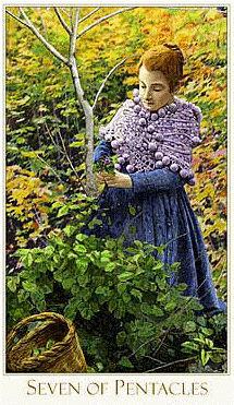 В Викторианском Романтическом Таро на Семерке Пентаклей мы видим молодую женщину, которая собирает фрукты. Она тепло укутана в шаль и это вместе с желтыми листьями позади нее, говорит нам, что сейчас ранняя осень, время сбора урожая. Она остановилась (взяла паузу), чтобы посмотреть на маленький букет цветов в ее руках; они точно не являются частью урожая, который она собирает сейчас, но они представляют что-то еще, намного прекраснее, чем вероятная проза жизни. Это момент сделать паузу, поразмышлять и возможно немножко помечтать.