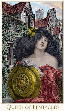 Это изображение указывает на зажиточность и состоятельность этой Дамы, но при прочтении, помните, что она может также представлять кого-то, кто высоко квалифицирован в практических делах. Она может быть прекрасным садовником, ремесленником, механиком или поваром и в то же время она может и не быть столь креативна как Дама Кубков, но она определенно хорошо нацелена на воплощение своих идей в реальность. Также ей нравится делиться тем, что она создала, она может быть и великодушной, и заботливой. Когда она приходит в Вашу жизнь, она точно сделает так, что Вы почувствуете себя более защищенным, окруженным заботой и уютом во всех материальных аспектах.