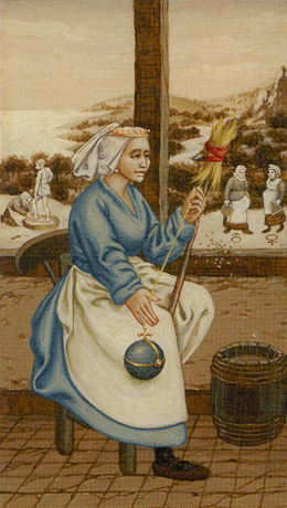 Милая женщина с открытым приветливым лицом. Она прядет сидя на открытой веранде. На шесте пучок соломы и из него она тянет нитку, которая в результате заканчивается голубым шаром с крестом. Символизм прост и изыскан одновременно – она мать всего живого, что родится на земле. Будь то дети, плоды, растения или интеллектуальные творения – все, что приобрело выражение и увидело свет.