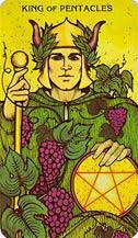 Король Пентаклей традиционно представляет надежного, практичного человека зрелых лет, который собственными силами добился успехов и положения в своей сфере деятельности (вероятно, это банковское дело или биржевое маклерство). При всех своих достижениях этот человек осторожен в подходах и, вероятно, не особенно умен. Король Пентаклей предсказывает улучшение финансового положения гадающего и возможное повышение по службе.