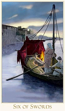 Шестёрка Мечей всегда вгоняет в тоску. Возможно, это кажется странным, потому что как раз эта карта не такая, как многие другие беспокойные или трагические карты масти Мечей. Карта не говорит о противоречии, суматохе или внутренней борьбе, она показывает путь перемен и несёт в себе сокрытое желание изменений. Но, может быть, это потому, что в классических образах колоды Райдера-Уэйта мы видим сцену, напоминающую о заключительной поездке Короля Артура к его месту отдыха на Острове Авалон. Также это может напоминать нам о греческой легенде, в которой говорится о том, что души должны быть переправлены через реку Стикс к их заключительному дому. Но какими бы не были наши ассоциации, всё это потому, что изображение перемещения или перехода всегда выглядит грустно.