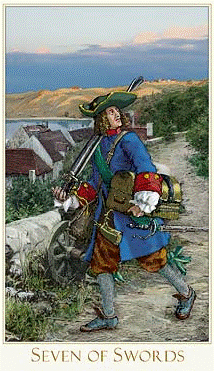 Данная карта Семёрка Мечей показывает солдата, обременённого оружием и мечами, убегающего из деревни. Она очень напоминает изображение в классической колоде Райдера-Уэйта, и те образы, которые также оставляют некоторую двусмысленность о том, что же происходит на самом деле. Человек украл это оружие? Он несет слишком много мечей, чтобы они все были его, и он выглядит воровато. Действительно ли он – дезертир (конечно, очень странно, что он один, далеко от остальной части армии)? В любом случае, очевидно, что солдат чувствует некоторое беспокойство о том, чтобы не быть замеченным; он оборачивается через плечо, проверяет, что за ним никто не наблюдает и никто его не сопровождает.