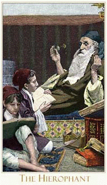 Наш Иерофант – пожилой исламский учёный, наставляющий двух маленьких мальчиков. Выглядят ли мальчики испуганными? Вовсе нет, они кажутся серьёзными, но при этом они спокойны и расслаблены; один из низ сидит, скрестив ноги, поглощенный чтением книги. Этот Иерофант не строгий наставник, мы чувствуем, что его учение способно восхищать, однако, мы чувствуем, что у него вряд ли бывают проблемы с дисциплиной во время занятий, он естественным образом располагает к уважению.