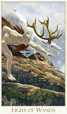 Восьмерка Жезлов говорит о событиях, которые происходят очень быстро – многие вещи в головокружительном темпе подходят к своему завершению. Изображение показывает нам Геракла, мчащегося с керинейской ланью, он застывает на один мимолётный момент и передает смысл этой карты с волнующей точностью.