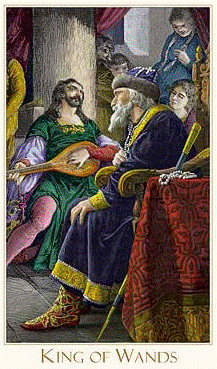 Наш Король Жезлов показан в относительно тихий момент, он наслаждается музыкальным представлением. Он окружён другими людьми, что показывает его явно социальную природу, он ярко и роскошно одет, его мантия и обувь щедро вышита, а шапка в жемчуге.