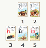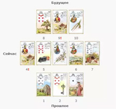 Выбирается всего три карты: первая показывает недавнее прошлое, влияющее на Ваш вопрос, вторая – настоящее и его влияние на Ваш вопрос, третья – конечный результат.