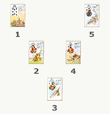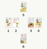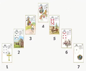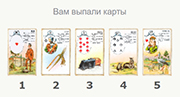 Позиции карт: 1. Подходит ли Вам та сфера, в которой Вы работаете; 2. Как Вас оценивает начальство; 3. Причина, почему Вы не продвинулись по карьерной лестнице до сих пор; 4. Качества характера, которые помогут Вам достичь успеха; 5. Качества характера, которые мешают карьерному росту.