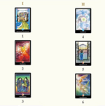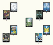 Позиции карт: Влияние прошлых воплощений; Главное в прошлом воплощении; Условия жизни в прошлом воплощении; Самая важная проблема из прошлого воплощения; Внутренние и внешние препятствия в этом воплощении, мешающие отработать карму; Способы решения этой проблемы; Предназначенное в этой жизни; Как это изменит Вас; Вероятное последующее воплощение.