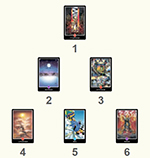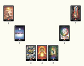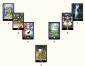 Позиции карт: Общее душевное состояние любимого; Эмоциональное отношение к Вам в прошлом; Влияние событий прошлого на любимого; Влияние событий настоящего; Влияние окружения; Эмоциональное отношение к Вам в будущем; Конечный результат.