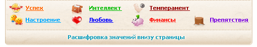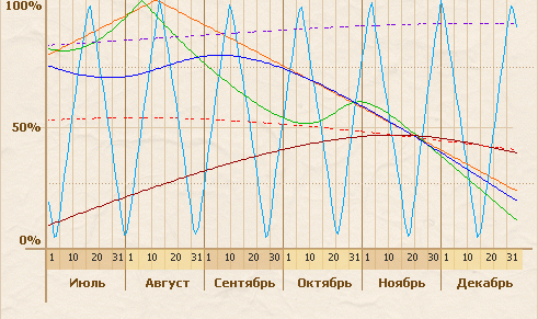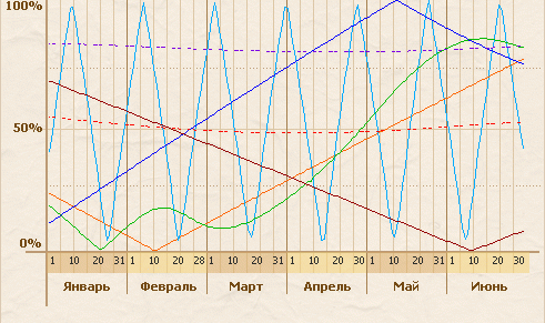На графике показана сила влияния планет на разные стороны Вашей жизни, в процентах – от 0% до 100%. Чем выше процент, тем сильнее выражена данная грань Вашей личности в рассматриваемый момент. Например, если любовь – 100%, а темперамент – 0% – данный период жизни наполнен любовью и минимумом агрессивности. Эдакая платонически-поэтическая любовь. Не исключены варианты любовь - 100% и темперамент – 100% (одно другому не мешает... или мешает? – решать Вам).