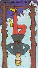 Обратите внимание на Последовательность Эонов. повешенный (висельник) – это изобретение адептов формулы 1.М.К.1. – 1.А.О.; в Эоне Исиды (Воды), предшествовавшем Эону Осириса, он был "Утопленным". Два столба виселицы, показанной на средневековой карте, были дном Моря и килем Ковчега в партеногенетической системе объяснения Природы и управления Ею. В том Эоне всякое рождение считалось эманацией Матери, или Богини Звезд, Н у и т, без мужского вмешательства. Всякую же смерть полагали возвращением к Ней. Это объясняет изначальное соотнесение этого Ату с Водой, а звука М с возвращением к Вечному Безмолвию, как в слове АУМ. Итак, данная карта особенно священна для Мистика, а фигура на ней изображена в ритуальной позе Практики, известной как "силоамский сон".