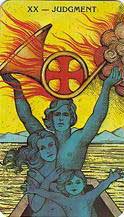Старая карта называлась "Ангел" или Страшный суд. На ней изображался Ангел, или Посланник, трубящий в фанфару, к которой был привязан флаг с символом Эона Осириса. Под ним раскрывались могилы и восставали мертвецы. Их было трое. У среднего из них руки были подняты и согнуты под прямым углом в плечах и локтях, как бы образуя букву Шин, связанную с Огнем. Соответственно, карта изображала разрушение мира Огнем. Это разрушение произошло в 1904 году по общей хронологии, когда огненный бог Гор занял место Иерофанта на востоке вместо воздушного бога Осириса. И в начале этого нового Эона уместно изложить послание ангела, принесшего весть о нем на Землю. Итак, новая карта должна быть адаптацией Стелы Откровения.