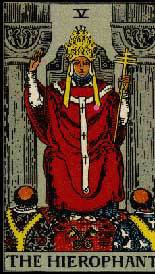 В античной культуре верховного жреца называли иерофантом, что буквально означает "тот, кто обучает священным делам". Это греческое слово состоит из двух частей: hieros — "священный", и phanes — "обучающий". В некоторых колодах Таро эта карта носит название Иерофант, а иногда её называют Папа.