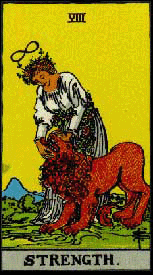 Сила – первая карта на этом женском пути. Ее традиционный номер, 11, при нумерологическом сложении (1+1) дает Двойку, то есть номер Аркана Жрицы. Взаимосвязь этих двух карт вновь напоминает нам, что на дальнейшем отрезке пути "делать" уже ничего не надо. Активный отрезок, путь Мага, уже пройден. Он вывел нас из материнского лона в окружающий мир. Тогда от нас требовались действия и навыки, чтобы мы могли выполнить стоящие перед нами задачи. Теперь же, в середине Путешествия, наша цель изменилась. Теперь нами руководит Жрица, а она требует постепенного отказа от всех тех мужских атрибутов власти, которые мы с таким трудом добывали на первом этапе. Теперь наше мощное, зрелое, но все еще жаждущее власти Эго должно осознать свои границы, стать вновь смиренным и скромным. До сих пор Герой мог и должен был набирать опыт, теперь же от него требуется всей душой открыться навстречу опыту. Отныне с нами будет происходить не то и не тогда, чего и когда захочет наше "Я", а то и тогда, чего потребует наша Самость. Произволом мы больше ничего не добьемся. Планировать больше ничего не удастся. Опыт будет приходить в свое время и в своем месте, а не на специально для этого задуманных мастерских или семинарах. Самое главное будет с нами происходить в самом прямом смысле непроизвольно, а если время для него не пришло, то и не будет, сколько бы мы ни стояли на голове, ни возносили молитвы и ни медитировали под запах благовоний или под томную нью–эйджевскую музыку. Вторая половина пути, начинающаяся здесь, может привести Героя к лицезрению Высшего, но только в том случае, если он к тому времени успел выполнить требования первой его половины.