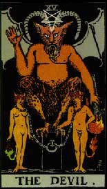 На этой карте изображены Адам и Ева, скованные цепями и находящиеся, как кажется, под властью Диавола. Она символизирует зависимость, подчинение и потерю свободы, то есть то, что мы вынуждены делать вопреки своим желаниям. Изображение подчеркивает, что они находятся в положении несвободы и подвержены внешним силам. Образ понятен: они связаны и потому уязвимы. Однако если внимательно рассмотреть картину, видно, что цепи соединяются с большим расстоянием, и в любой момент люди могут освободить себя от них. Проблема заключается в том, что осознать свою зависимость и причины этого сложнейшего состояния бывает нелегким делом. Первым шагом к решению проблемы является осознавание своей зависимости и понимание её источников.