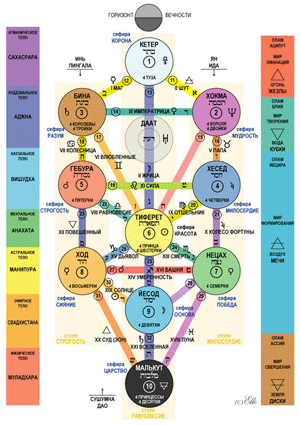 К е т е р – точка является началом всего. Теория большого взрыва, принятая большинством физиков, повествует лишь о том, что было давно известно оккультизму: единая точка, взорвавшись, творит все многообразие сотворенного (и не сотворенного, добавим мы от себя). Но ни один физик не способен проследить ту символическую закономерность, по которой происходит этот процесс творения, для этого нужно достаточно понимать символы Таро и Кабалы.