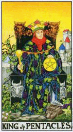Король Пентаклей Таро олицетворяет власть и влияние человека, заинтересованного в поддержке наук и искусств, хотя и ориентированного на собственную выгоду.