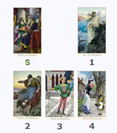 Позиции карт: Что внутри семьи толкает мужа к уходу; Что извне семьи толкает мужа к уходу; Что Вам надо сделать, чтобы муж остался; Как Вы будете себя чувствовать, если удержите мужа; Как Ваш муж будет чувствовать себя, если останется.