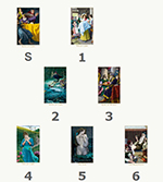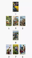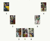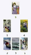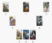 Позиции карт: Общее душевное состояние любимого; Эмоциональное отношение к Вам в прошлом; Влияние событий прошлого на любимого; Влияние событий настоящего; Влияние окружения; Эмоциональное отношение к Вам в будущем; Конечный результат.