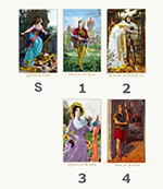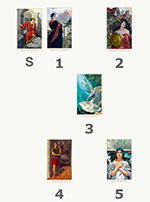 Позиции карт: Выйдете ли Вы замуж в течение года; Выйдете ли Вы замуж в ближайшие два года; Что нужно сделать, чтобы ускорить замужество; Какие препятствия стоят у Вас на пути к замужеству; Кто может стать Вашим мужем.