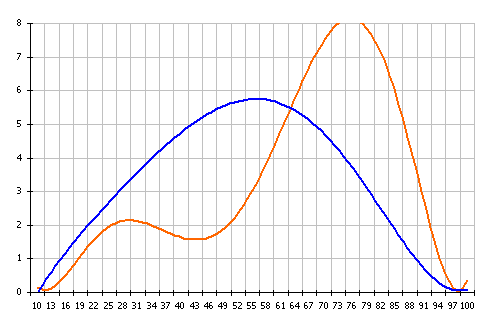 - Нижний график – сравнение расчетных линий смерти мужчин и женщин. Мужчины – синяя линия. Женщины – красная линия.