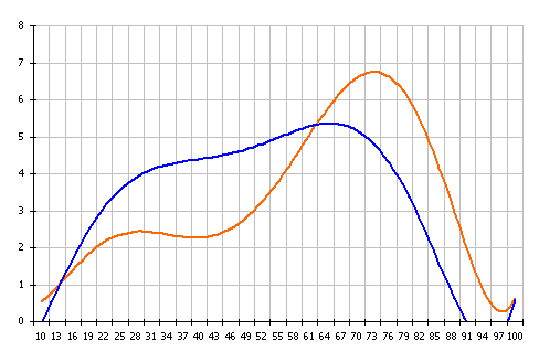 - Нижний график – сравнение расчетных линий смерти мужчин и женщин. Мужчины – синяя линия. Женщины – красная линия.