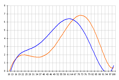 - Нижний график – сравнение расчетных линий смерти мужчин и женщин. Мужчины – синяя линия. Женщины – красная линия.