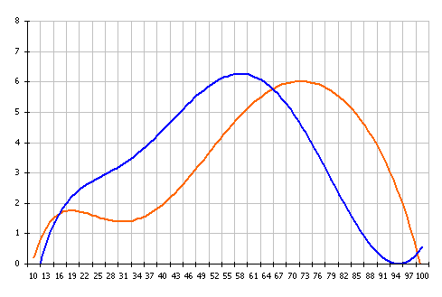 - Нижний график – сравнение расчетных линий смерти мужчин и женщин. Мужчины – синяя линия. Женщины – красная линия.
